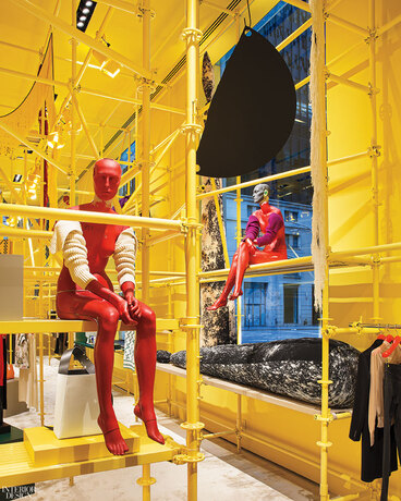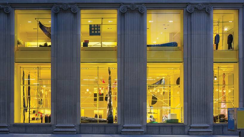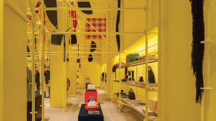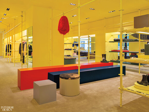 Помітно, що креативний директор Раф Сімонс і Стерлінг Рубі ґрунтовно поставилися до вибору фарби для стін і стель. Для них було важливо передати запал і чистоту кольору. Основним кольором для стін, стель та підлоги в престижному магазині став Majestic Yellow 355 від Benjamin Moore. З огляду на те, що приміщення магазину розташовано в сірій будівлі з бетонними фасадами, контрастний ефект вийшов просто приголомшливим.