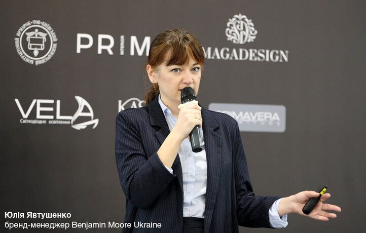 Бренд-менеджер Benjamin Moore Ukraine Юлія Явтушенко ознайомила гостей заходу із різноманітними палітрами і колекціями кольорів інтер’єрних фарб, а також розповіла про топ-позиції, які користуються найбільшим попитом у дизайнерів і архітекторів.