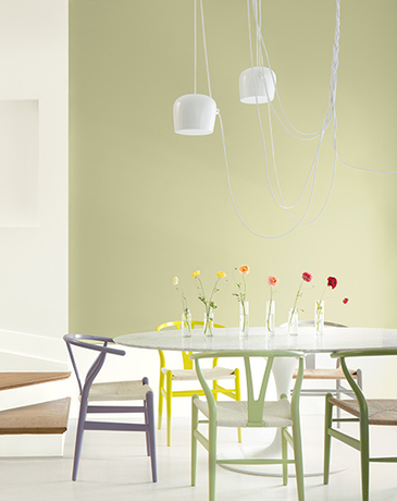 Коли команда експертів Benjamin Moore об’єднала свої колірні ідеї, виникла надихаюча історія про гаму зелених кольорів. Зелень у кількох тонах було обрано як основу для роботи, сигналізуючи про тяжіння до збалансованих, природних кольорів, що спонукають відчувати себе у безпеці, спокої, затишно і медитативно.